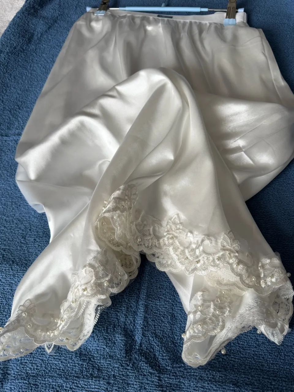 Handmade lingerie featuring breathable champagne satin fabric and detailed navy blue lace trim.