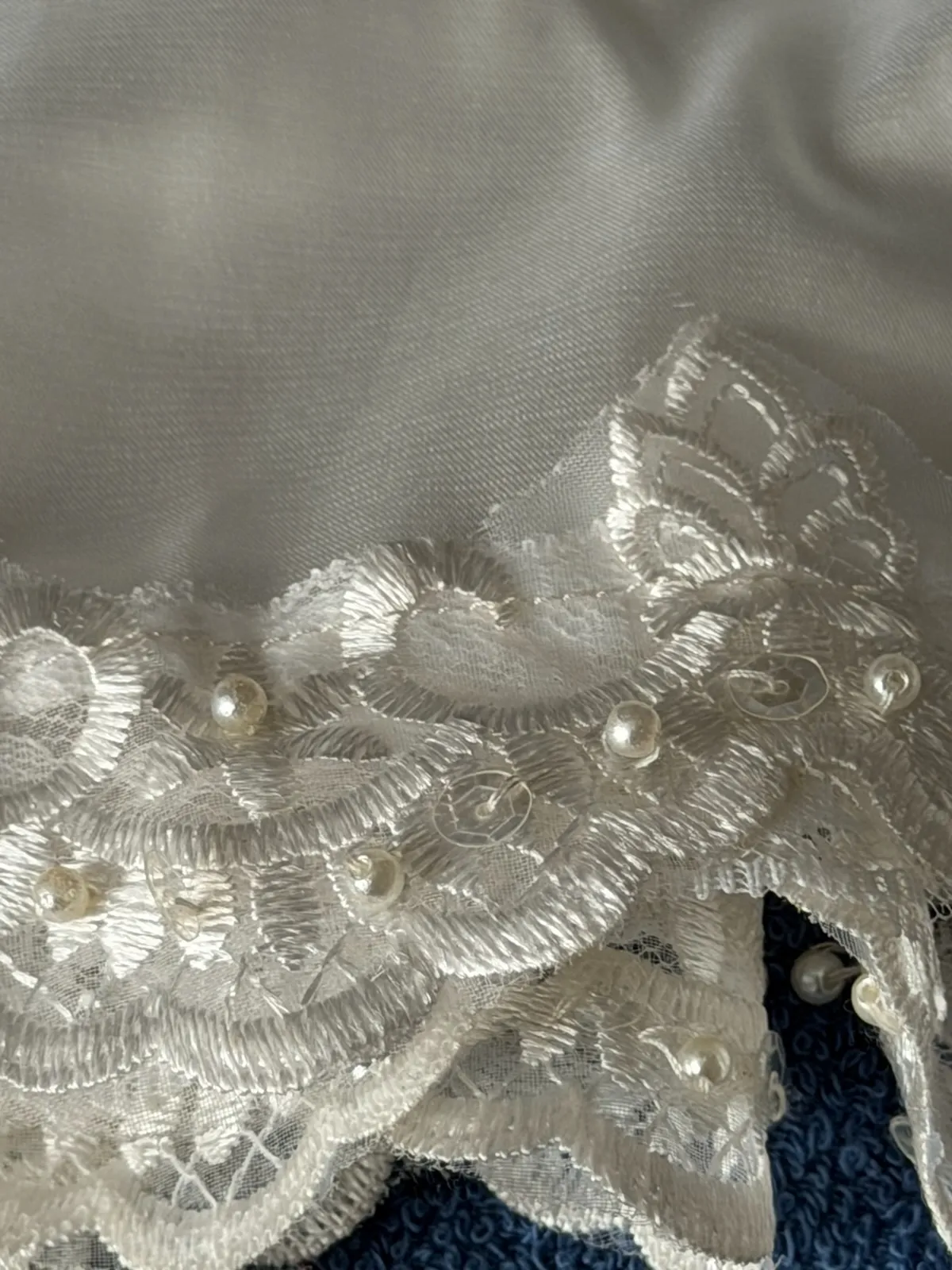 Full view of handmade lingerie in breathable champagne satin with a scalloped gold lace hem.