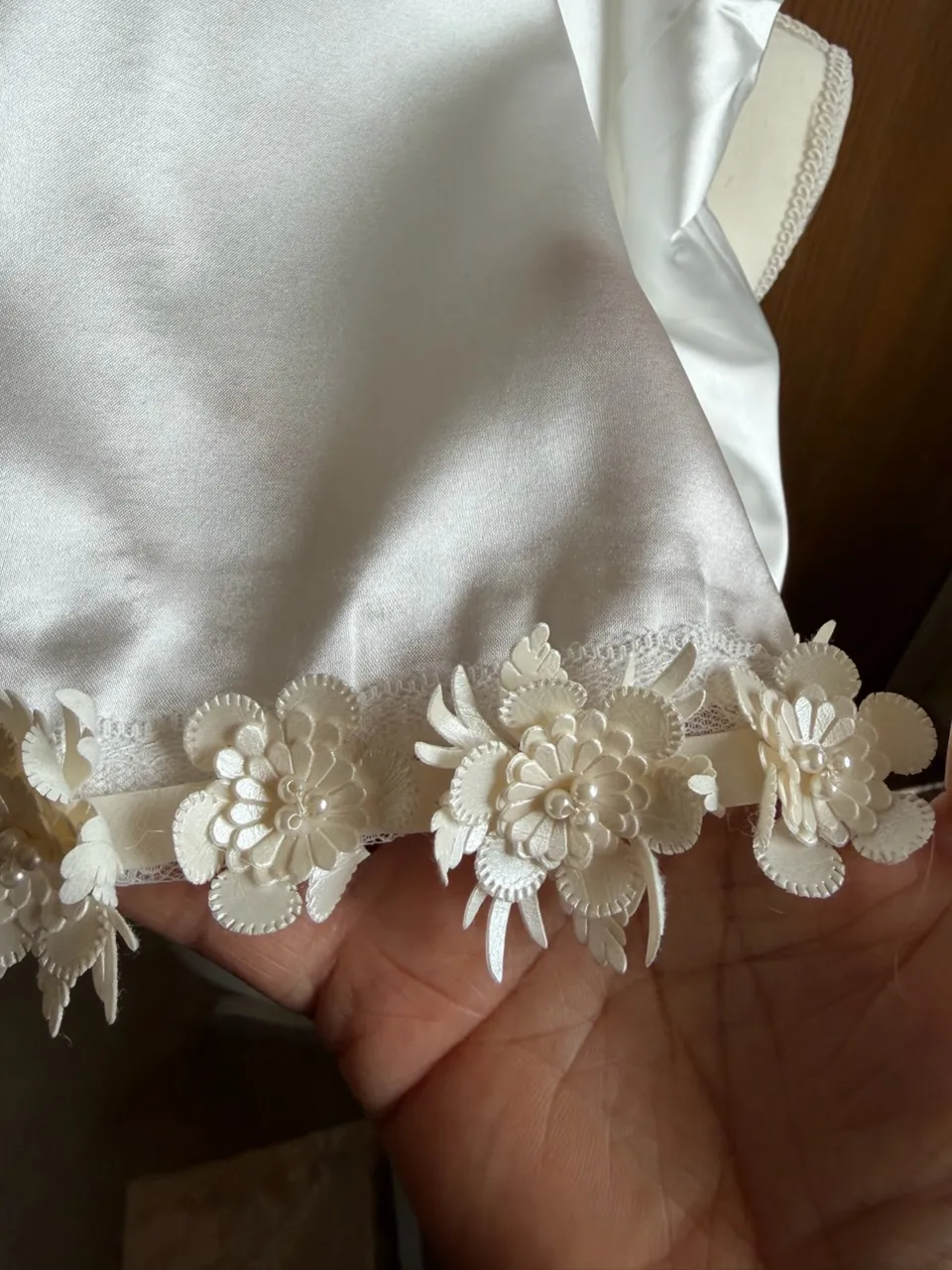 Features 3D flower lace trim with pearl embroidery, crafted on polyester lace ribbon applique patchwork. Stylish, feminine, and durable, this detailing resists snagging and adds a luxurious layered look.